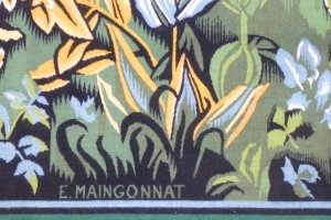 Our cartoon is typical of Maingonnat's work: local fauna and flora, as if in symbiosis, are illustrated in a reduced range of colors: our posthumous weaving has evolved the original chromatic range, which has become more vivid.
